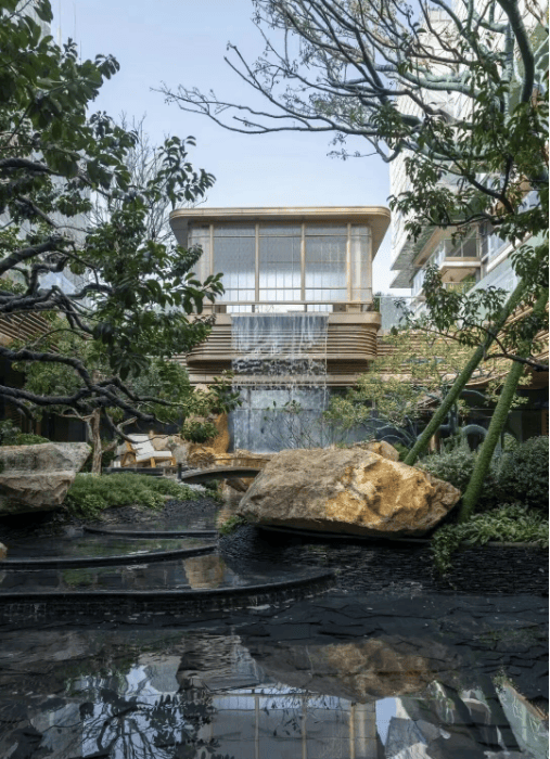 社区内精心布局了清芬阶、吟月池、无事亭、晓语间、善归庭、可心台等景观节点,每一个节点都经过精心设计,尺木寸石之间,皆藏乾坤,尽显岭南园林的精致与韵味。其中,吟月池作为下沉式山水会客厅,是园林的核心景观,飞瀑、叠石、流水、绿植错落排布,水光映壁,流影藏真,闲暇时,业主可在此休憩、聊天、观景,感受自然的静谧与雅致。