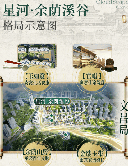 星河·余荫溪谷的地块布局,充分借鉴了余荫山房“聚气纳福”的理念,地块形如玉如意,格局似官帽,环抱如金缕玉带,寓意深远,既符合传统人居的风水讲究,又能最大化利用土地资源,打造舒适的居住环境。