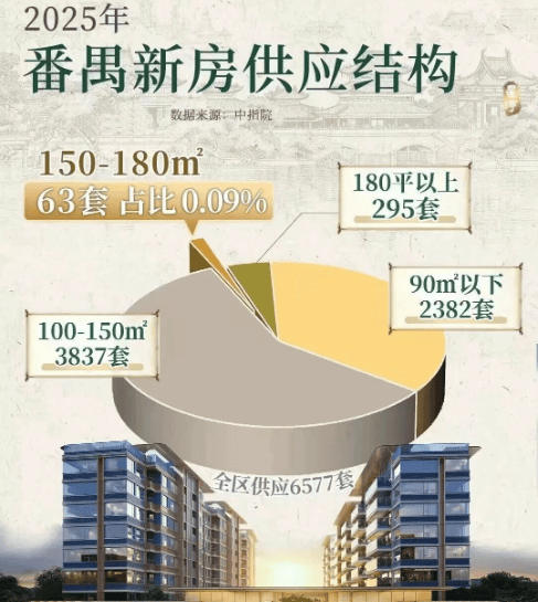 对于改善型购房者而言,150-180㎡的户型是主流需求,但这样的优质房源却极度稀缺。链家数据显示,番禺2.4万套挂牌房源中,150-180㎡户型仅占4%,而楼龄10年以内的,全番禺仅50套;中指院数据则显示,2025年番禺新房供应6577套,其中150-180㎡户型仅63套,占比不足1%。