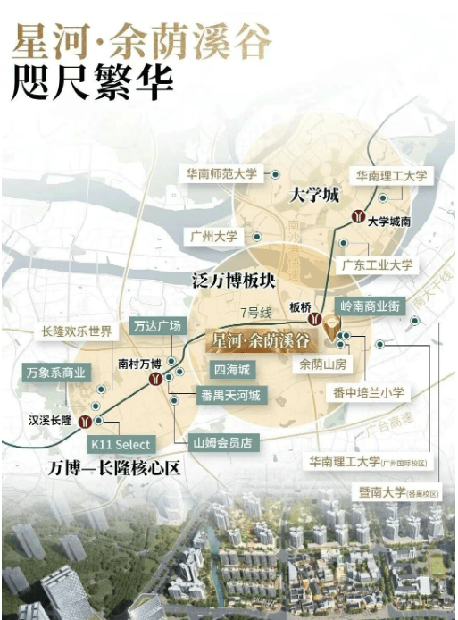1. 直达万博CBD:仅需2站即可到达万博站,万博CBD作为番禺的核心商圈,汇聚了天河城、万达广场、万象天地、K11、四海城等大型商业体,购物、娱乐、餐饮、办公一应俱全,业主下班或周末,可快速前往万博商圈,享受繁华的商业体验;