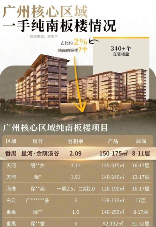 在当前的新房市场中,大多数楼盘采用板塔结合的设计,舒适度无法做到一视同仁,而星河·余荫溪谷采用纯南向板楼设计,在广州核心区域极为稀缺——根据不完全统计,广州核心区域在售盘340多个,做到纯南向板楼的不到10个,占比仅约2%,而叠加8-11层低密洋房的,更是只有余荫溪谷一家。