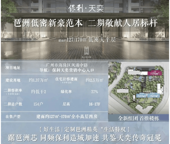 答:开发商是保利地产,属于高端 “天字系”,定位琶洲 CBD 低密改善盘,主打 127-170㎡全南向小高层板楼。