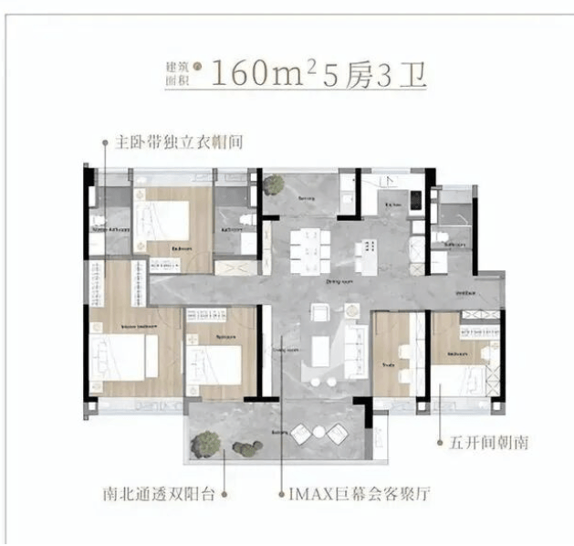 建面约XXX㎡四房: 经典“四叶草”布局,四开间朝南,客厅连接阔景阳台,主卧套房设计配备独立卫浴及衣帽间,功能分区明确,互不干扰,是改善家庭的终极之选。