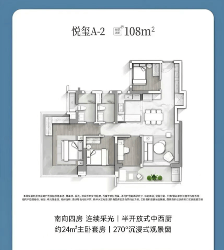 对于首次置业或年轻家庭,108㎡四房是高性价比之选。总价约600-670万元,入门即享四房格局。进门处的灵动空间可灵活改造为茶室、书房或临时客卧;U型厨房搭配岛台设计,优化烹饪动线;主卧配备270°U型飘窗,采光与视野俱佳,提升居住幸福感。