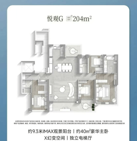 对于追求更高品质生活的多代同堂家庭,170㎡与204㎡大户型尤为值得关注。170㎡四房四开间朝南,主卧套房面积约28㎡,配备沉浸式观景飘窗,半开放式中西厨兼顾中式爆炒与西式烘焙,生活更富弹性。204㎡大平层则配置独立电梯入户,9.6米南向观景阳台连通客厅与次卧,48㎡豪华主卧套房内设酒店式双台盆主卫,另设X幻变空间,可根据家庭结构灵活改造为书房、影音室或儿童活动区,充分满足个性化生活需求。此外,项目还提供约300㎡的大平层产品,为塔尖人群定制终极改善居所。