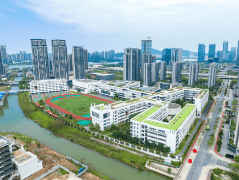 项目紧邻广州市湾区实验学校,该校是南沙区政府与广州市教育局合作共建、委托广州市教育研究院管理的九年一贯制公办学校,纳入广州实验教育集团核心序列,是区域重点打造的标杆学府。学校占地面积约106亩,规划小学36班、初中36班,总计72个教学班,可提供3420个优质学位,办学规模位居南沙前列。学校硬件设施一流,配备行政楼、学术报告厅、标准运动场、真草足球场等现代化教学设施,师资团队由骨干教师与海内外名校硕博人才组成,教学实力与教研水平在南沙处于领先地位。