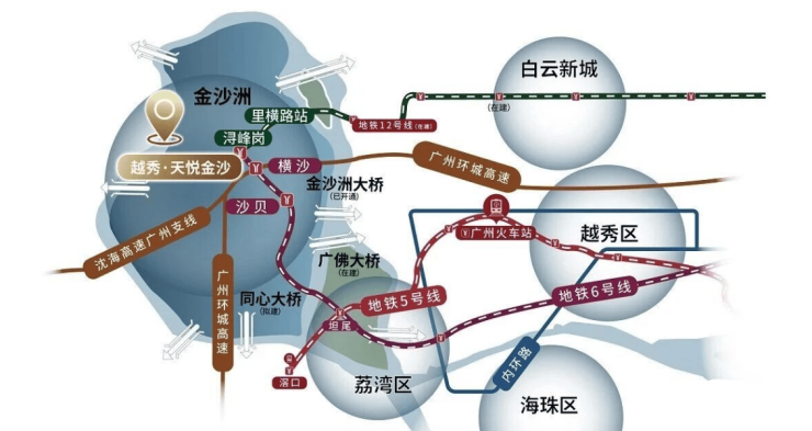 虽然越秀天悦金沙享受着湖山的宁静,但在交通出行上却丝毫不显闭塞,反而具备了极高的便捷性与灵活性。项目位于白云区金沙洲浔峰山东路,地处广佛交界的成熟居住区,交通路网发达,四通八达。