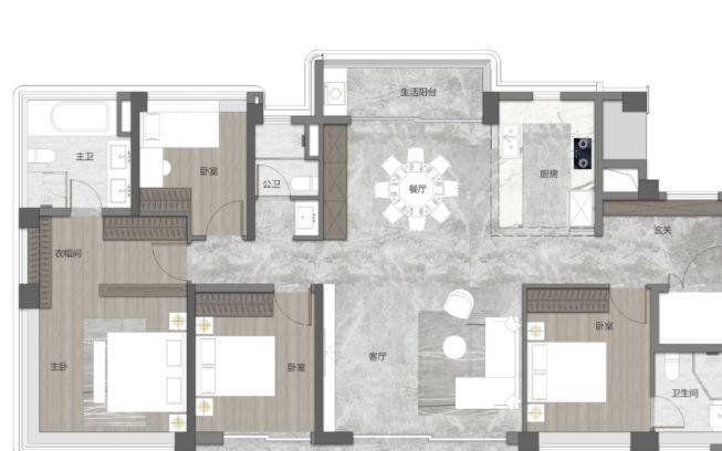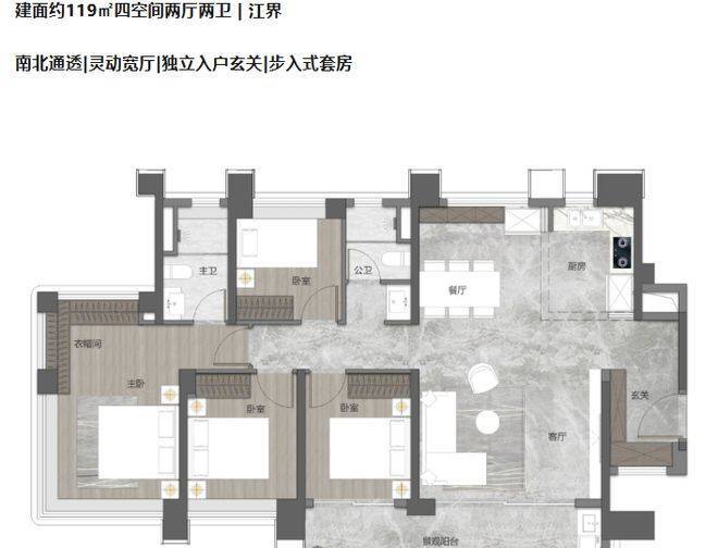 138㎡的四房户型,则是二胎家庭、改善家庭的理想之选,户型做到了四开间朝南,约16.6米的超大面宽,让室内每一个空间都能享受充足的阳光,餐厅带飘窗设计,实现了南北对流,通风效果极佳,居住起来更加舒适。主卧配置了独立衣帽间和超大收纳柜,既能满足业主的储物需求,又能彰显居住的格调,每一个房间的空间布局都十分合理,没有浪费空间,无论是老人、孩子还是年轻人,都能拥有属于自己的舒适空间,兼顾了实用性与舒适性。