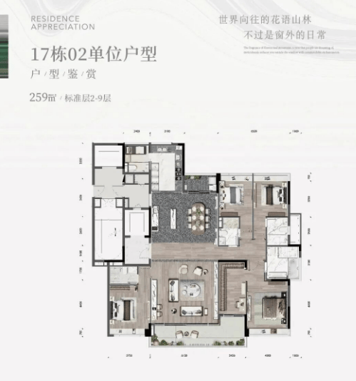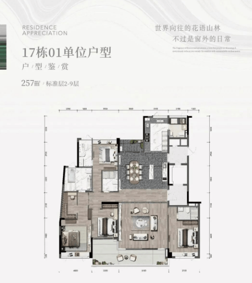 合景臻颐府占地面积约为5万平方米,建筑面积达9.3万平方米,整体规划由17栋6-11层高的建筑组成,总户数为315户,容积率仅为2.0,绿化率达到35%。项目提供两种户型选择:建面约260-350平方米的巨幕畔山大平层和建面约235-273平方米的南北双庭院院墅,所有户型均采用三梯两户设计,确保住户享受私密性和便捷性。此外,项目还配备有国际品牌奢装交付标准,进一步提升了居住品质。