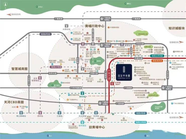 合生·中央城占据科学城版块的核心枢纽位置,坐享区域发展的顶级红利。科学城作为广州东进的战略高地,汇聚了超130家世界500强企业,是万亿级的高科技产业集群所在地,强大的产业基础带来了大量高素质人才与旺盛的居住需求。在交通出行方面,项目构建了“三纵五横”的立体交通网络。轨道交通便捷,项目周边有地铁6号线(香雪站)、7号线(加庄站)及规划中的线路环绕,可快速接驳全区。自驾优势尤为突出,项目近邻广深高速、广园快速路、开创大道等城市主干道,通过开放大道可高效连接珠江新城、金融城等核心商务区。此外,社区内部规划了2个公交首末站及多个公交站点,进一步织密了日常出行的毛细血管网络,满足业主多元化的通勤与生活需求。