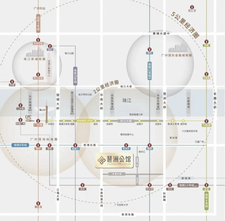 琶洲中心琶洲公馆拥有广州最完善的立体交通网络 周边多维交通系统贯通全城 地铁 高速 隧道 桥梁 城轨 航运等多方式无缝衔接 六条地铁线路覆盖 包括已开通的八号线 四号线 三号线 十八号线 以及建设中的十一号线 十二号线 可快速通达广州各核心片区 同时三大高速环绕 包括华南快速 新光快速 环城高速 便捷连接全市与周边城市 五大隧道及三大桥梁进一步缩短出行时间 项目毗邻琶洲港澳码头 无论商务往来或生活出行均十分便捷 从琶洲中心出发 约二十分钟可达珠江新城 十五分钟抵达天河 核心商务圈轻松切换