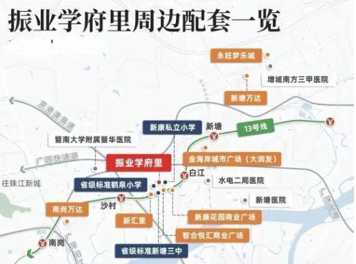 振业学府里地处增城新塘板块,紧邻13号线沙村站,距离白江站约一站路,形成对区域主要通勤节点的便捷接入。地铁13号线可直达黄埔区及天河区核心地段,接驳广州市中心与主要产业区,提供高效的通勤条件。