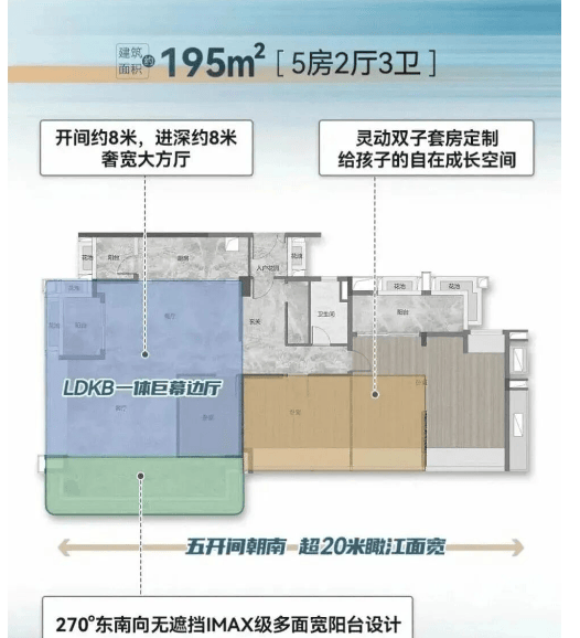 目前开放板房:项目已开放95、138和195㎡三个户型的板房,业主可前往现场实地参观,直观感受户型空间尺度、布局设计及江景视野。其中,195㎡大平层户型需验资500万方可参观,彰显高端定位,该户型阳台长度约8米,LDK客餐厅面积约70+平,观江面长达约16米,空间感堪比酒店江景宴会厅。