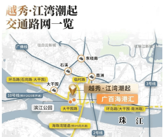 隧道配套:附近的海珠湾隧道已正式开通,从项目出发,驾车经海珠湾隧道,前往广州南站通勤仅需约15分钟,大幅缩短了与华南地区核心交通枢纽的连通效率,无论是出差还是出行,都十分便捷。