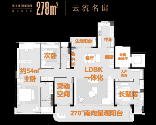 这款约275㎡的四室两厅三卫户型,是西派尊府的经典爆款户型,主打奢适改善,空间尺度开阔,布局合理,无任何浪费空间,方正通透,采光通风效果极佳,做到了完美的动静分离、干湿分区,既能满足多代同堂的居住需求,又能保证每一位家庭成员的私密性与舒适度,是高端改善家庭的首选户型。