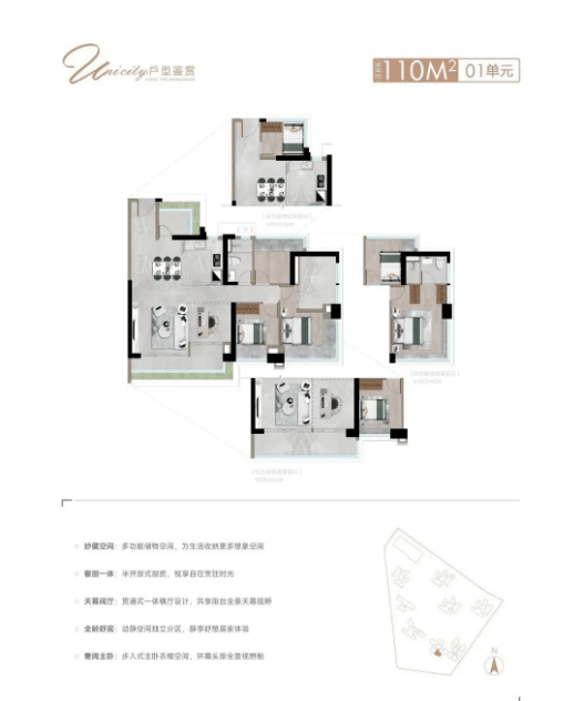 1. 布局设计:入户设置宅间花园,拥揽诗意栖居的四季风光,打造专属的入户景观,提升归家仪式感;整体采用全龄四房布局,从二人世界到四代同堂,都能满足居住需求,给成长预留更多空间;动静分区明确,公共区域与私密区域分离,保障家人的休息质量,同时客厅、餐厅、阳台连通,空间通透,互动性强。
