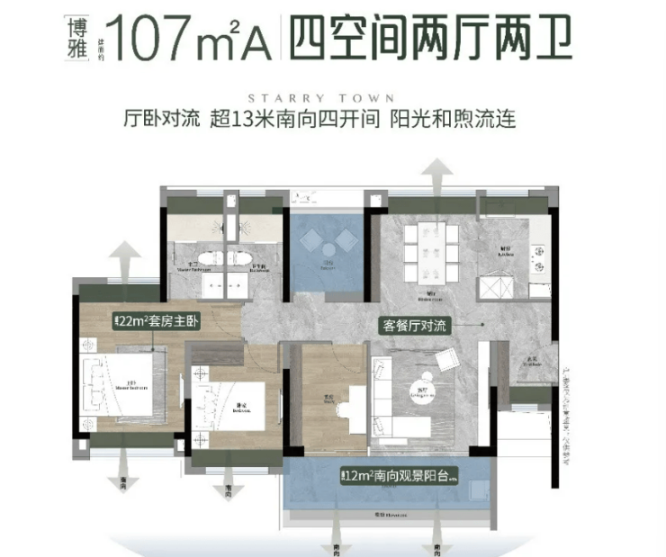 107㎡A 户型四房两厅两卫,配置南向仪式观景玄关,入户归家氛围感十足,4.5 开间朝南格局,客厅与主卧双向南北对流,双面宽观景阳台搭配多飘窗拓展空间,室内交互式方厅可灵活拆分组合,适配二胎家庭、三代同堂多元居住需求。