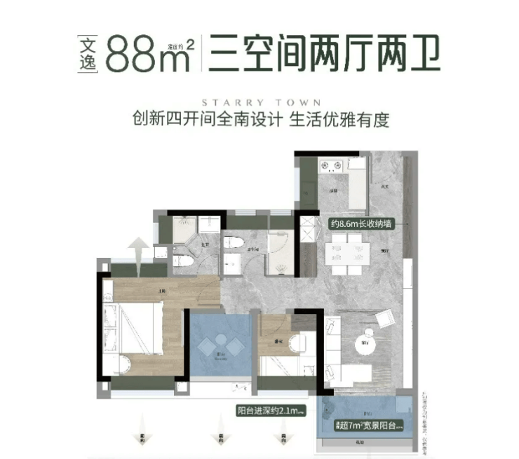 88㎡三房两厅两卫户型,片区罕见四面宽朝南小户型,三卧室全南向排布,整体景观采光线长达 11 米,全屋精细化收纳设计,约 10 米超长收纳墙面,完美收纳家庭各类生活用品,适配刚需三口之家,总价门槛友好,空间功能齐全,无多余浪费面积,得房率远超同片区同类户型。