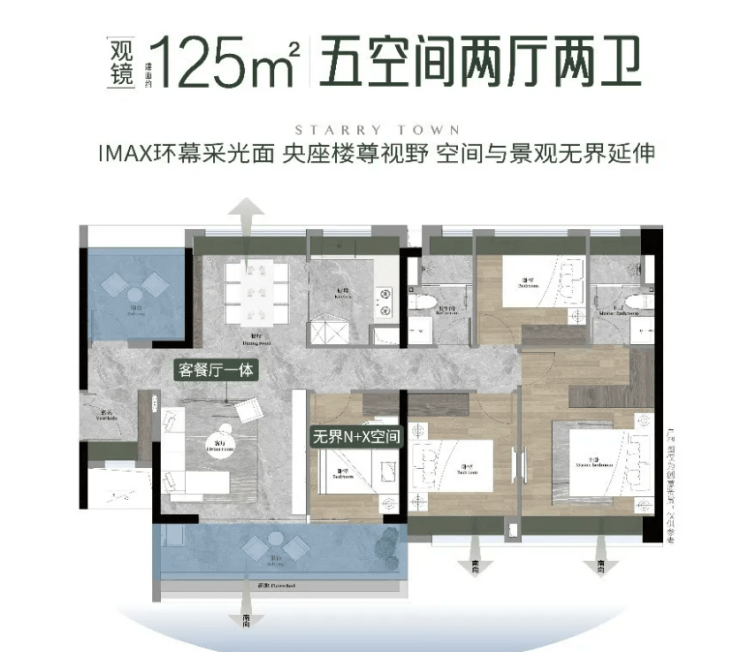 125㎡五房两厅两卫户型,4.5 开间朝南,餐客一体南北通透大横厅格局,百变大方厅可灵活改造多功能空间,双面观景阳台搭配全屋南北飘窗,室内实用空间充足,得房率优异,适配改善多孩家庭、长期大家庭居住,格局大气通透,居住尺度宽敞舒适。