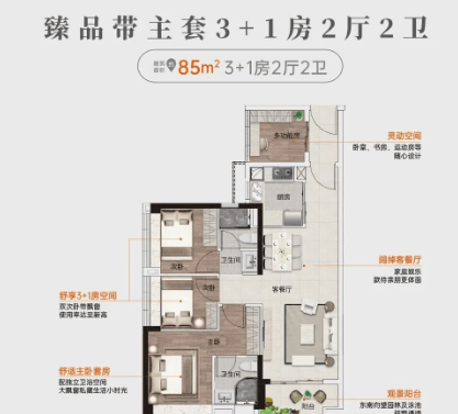 建面约 85㎡ 4 房 2 厅 2 卫:双次卧带飘窗,使用率极高。东南向望园林及泳池,配备独立卫浴空间,大飘窗为生活增添更多美好。
