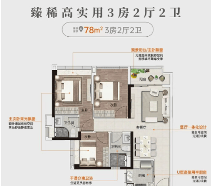 建面约 78㎡ 3 房 2 厅 2 卫:具备无遮挡阔境视野空间,可拥揽城市繁华央景。过道 0 浪费,额外增加收纳空间,让业主享受舒适静谧生活。