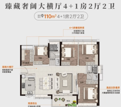 建面约 110㎡ 5 房 2 厅 2 卫:打造私家小花园,可享受大城、园林双景。全面满足三胎或三代同堂大家庭的居住需求,极致面积做五房,相比同户型价格省 200 万,性价比极高。