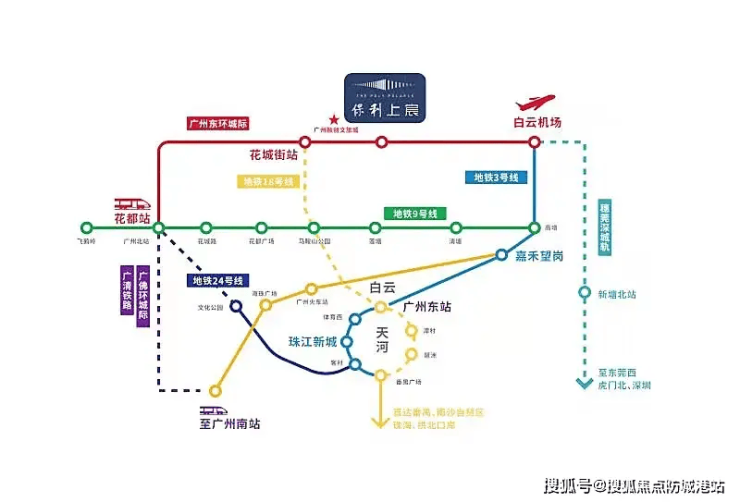 路网交通:项目周边“三横三纵”主干道(三横:迎宾大道、紫薇路、杜鹃路;三纵:天贵路、凤凰北路、曙光路)通达全城,自驾至珠江新城约35分钟(非高峰期),至白云机场仅15分钟。
