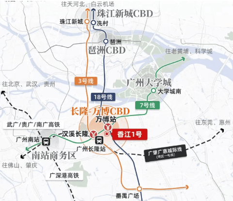 香江 1 号位于广州番禺万博 CBD 核心,万博 CBD 是广州 “珠金琶万” CBD 矩阵的重要组成部分,是千亿级产业平台,2024 年营收破千亿,获评 “中国商务区总部经济竞争力 20 强”,汇聚希音、阿里巴巴国际等超 42 万市场主体,是广州南部的经济引擎。区域历史悠久,文化底蕴深厚,自古以来便是广州南部的交通枢纽与商业中心,如今更是大湾区的核心节点。交通方面,项目坐拥三地铁交汇(7 号线、18 号线、3 号线),四站直达广州南站,30 分钟可达珠江新城,50 分钟直达香港西九龙,构建大湾区一小时生活圈;自驾出行可快速接驳广州绕城高速、南沙港快速、广深高速等,畅达全城;公交线路密集,覆盖番禺全区及广州主城,出行便捷无忧。番禺 “十五五” 规划重点聚焦万博 CBD,推动产业升级、城市更新、生态优化,打造世界级 CBD+3000 亩长隆森林的稀缺生态格局,未来将成为集商务、居住、休闲、文化于一体的城市新中心。居住于此,可尽享千亿级产业红利、顶级城市配套、生态宜居环境,实现 “出则繁华,入则静谧” 的理想生活。