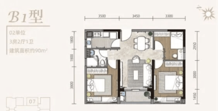 设计亮点:动静分区明确,主卧配备独立卫生间;客厅连接景观阳台,采光充足;餐厅与厨房紧密相连,方便就餐;次卧可作为儿童房、书房或客房使用,灵活多变。