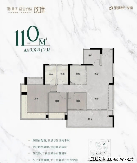 8米横厅:连接景观阳台,主卧270°转角飘窗,次卧连通6.3米阳台;