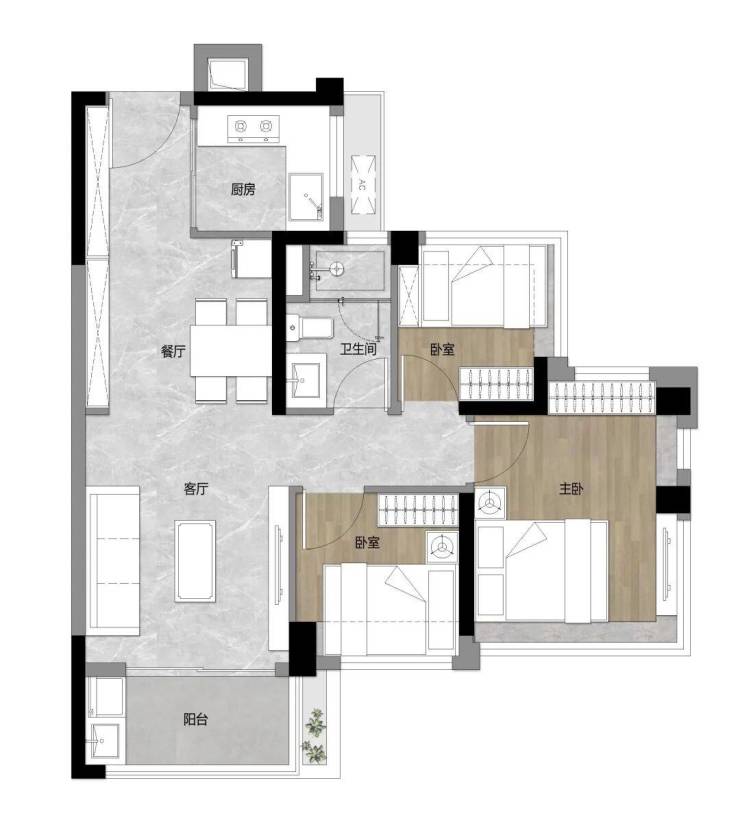 主打63㎡、77㎡、82㎡三种户型,皆为三房设计,适合小家庭居住。