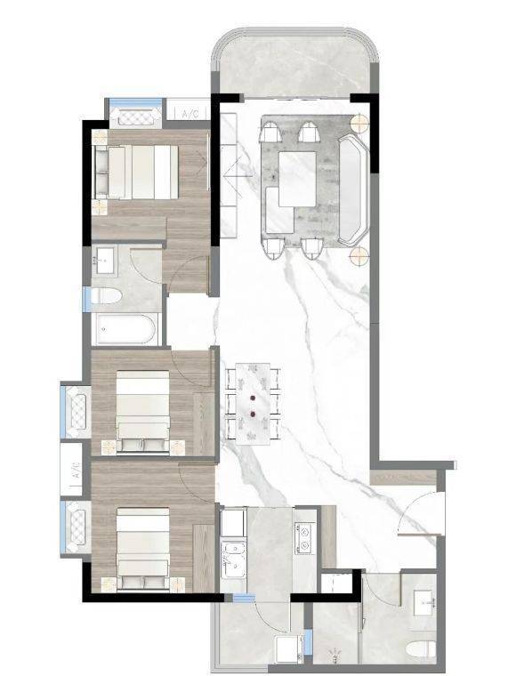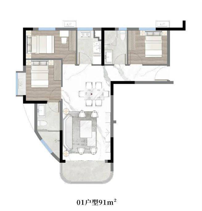 约 91㎡三房两厅两卫带主套(01 户型):三房设计满足家庭人口较多的需求,客厅、餐厅一体化设计,搭配观景阳台,营造宽敞明亮的公共活动区域。主卧带独立卫生间,保障主人生活私密性与舒适度。另外两个次卧空间适中,可灵活布置家具。