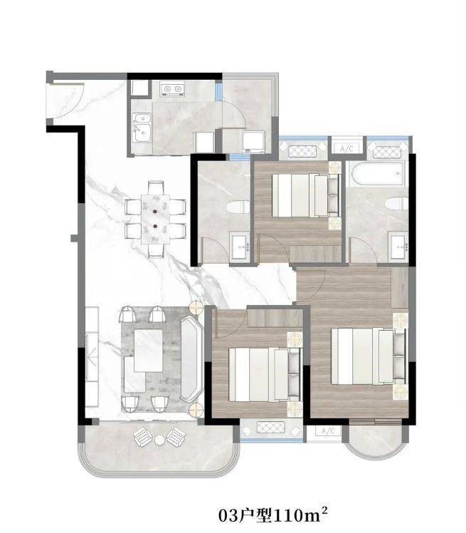 约 110㎡三房两厅两卫带主套(03、04 户型):110㎡的面积让户型空间更为阔绰,三房布局宽敞舒适。客厅、餐厅空间开阔,适合举办家庭聚会或社交活动。主卧套间不仅有独立卫生间,还可设置衣帽间,满足主人对生活品质的追求。另外两个次卧也能提供舒适的休息空间。