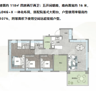 建面约118㎡的四房两厅两卫户型,是项目中最具性价比的选择之一。该户型采用五开间朝南的布局,南向面宽长达约16米,确保了室内充足的采光与通风。LDKG(客厅、餐厅、厨房、阳台)一体化布局,打破了传统空间的界限,营造出宽敞明亮的公共活动区域。特别值得一提的是,该户型配备了院落式大阳台,不仅增加了室内的使用面积,更为业主提供了休闲、观景、种植等多重功能空间。户型使用率最高可达约107%,同等建筑面积下,实际使用空间远超常规户型,相当于免费赠送了10余平方米的实用面积,极大地提升了居住的性价比。
