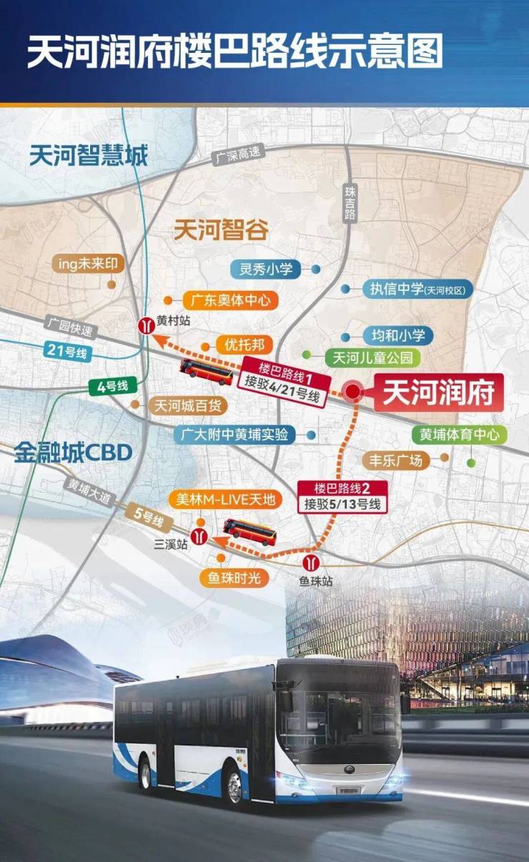🚌 特色交通:作为市中心首个配套楼巴的社区,交付起 5 年业主免费使用,定制两条路线 —— 路线 1 直达奥体中心(接驳地铁 4/21 号线黄村站),路线 2 直达鱼珠 - 三溪商圈(接驳地铁 5/13 号线鱼珠站),3 站直达金融城,7 站抵达珠江新城,公共交通便利性媲美近地铁楼盘。