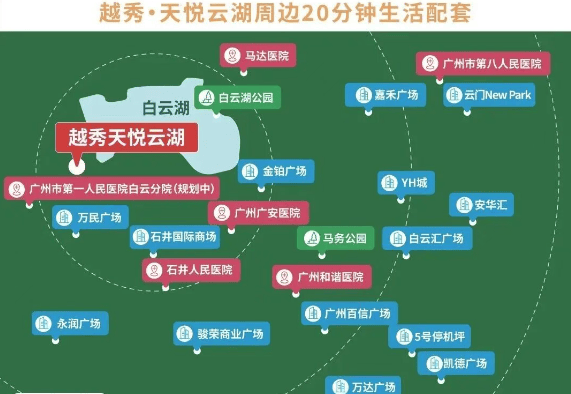 医疗配套方面,周边有广安医院、广州东方医院、石井人民医院三家医疗机构,为业主日常就医、健康体检提供便捷服务;同时广州市第一人民医院已敲定在板块内规划建设综合性三甲医院,未来落地后将进一步提升区域医疗水平,为家人健康保驾护航。生态资源是项目的核心优势之一,项目距白云湖直线距离仅50米,白云湖作为广州城央最大人工湖,拥有约3000亩水体面积与近10公里绿茵跑道,业主可步行直达湖边,日常散步、慢跑、休闲都能近距离享受湖景生态,部分高层房源在家即可眺望湖光景色,实现推窗见景的居住体验。