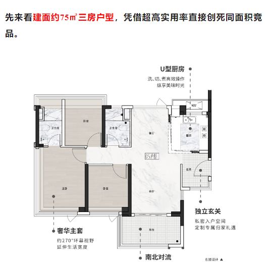 信达·繁花里主打建面约75-108平方米的全南向三至四房户型,每个户型均以高效实用率(最高可达120%)著称。其设计亮点包括独立玄关、U型厨房布局、豪华主卧套间等,尤其是部分户型配备的超大阳台设计,让住户可以享受到更多的户外空间。