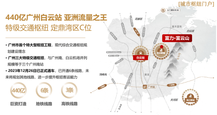 项目紧邻广州白云站,直线距离 3.5 公里,15 分钟即可抵达越秀老城区,20 分钟直达珠江新城。白云站总投资 440 亿元,规划 1 轻轨、2 高铁、7 地铁立体交通网络,串联大湾区城际交通脉络,大幅拓宽业主出行半径。公路交通方面,项目紧邻白云大道北、黄石东路等主干道,接驳机场高速、华南快速等高速公路,自驾 35 分钟可达天河核心区,顺畅接驳广州白云国际机场、广州南站等交通枢纽。
