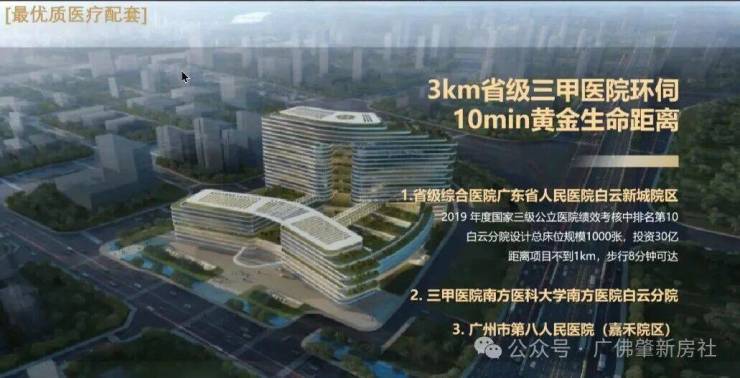 项目周边医疗配套完善,3 公里范围内拥有多家三甲医院,包括南方医院白云分院、广州中医药大学第一附属医院白云医院等,医疗资源丰富。项目与广州市第一人民医院白云院区直线距离约 5 公里,该院为广州市卫健委直属重点公立三甲医院,提供全方位医疗服务。社区内部规划社区卫生服务中心,配备全科医生与基础医疗设备,满足业主日常健康管理需求。