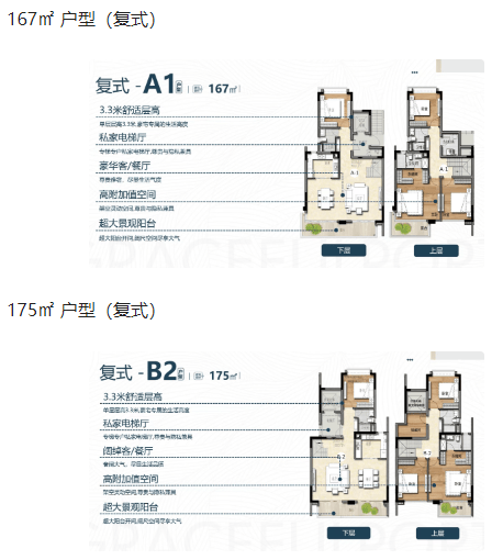 203㎡三房+1书房+1间两厅三卫 此外,还有复式户型可供选择,如164㎡、167㎡、175㎡和183㎡,以满足不同客户的个性化需求。