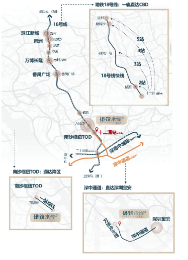 项目紧邻深中通道和广州地铁18号线十二涌站,形成了高效的立体化交通网络。未来,随着更多交通基础设施的建设完成,将极大提升该区域的通达性和便捷性,进一步拉近与各大城市中心的距离。