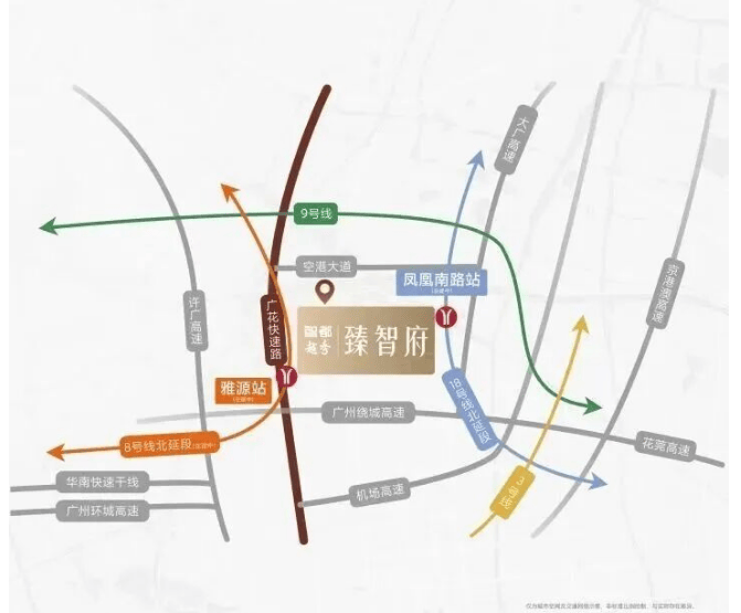 地铁线路:距离地铁8号线北延段(在建)雅源站直线距离约550米,两站到白云,三站到广州北站;距地铁18号线北延段(在建)凤凰南路站直线距离约1公里,五站到广州东,连接湾区五个城市。