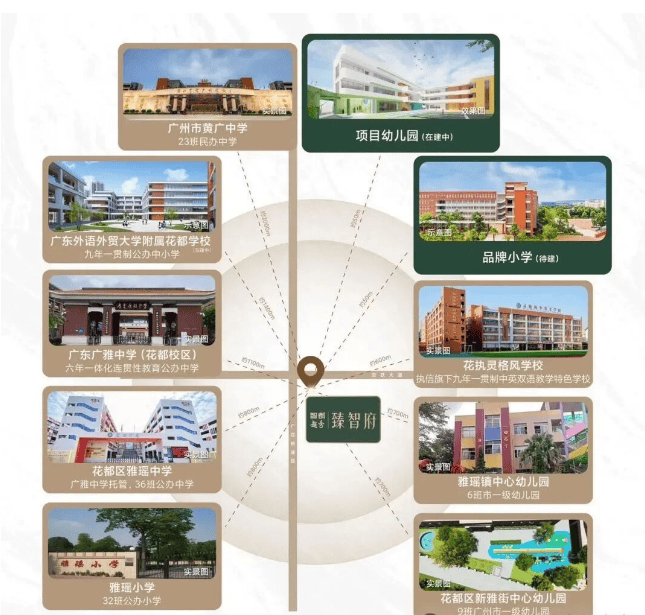 社区内配建幼儿园,并规划有36班花雅小学,拟纳入广东广雅教育集团管理。此外,周边1.5公里范围内涵盖从小学到高中的全龄段教育资源,如雅瑶小学、广雅中学、黄广中学等。