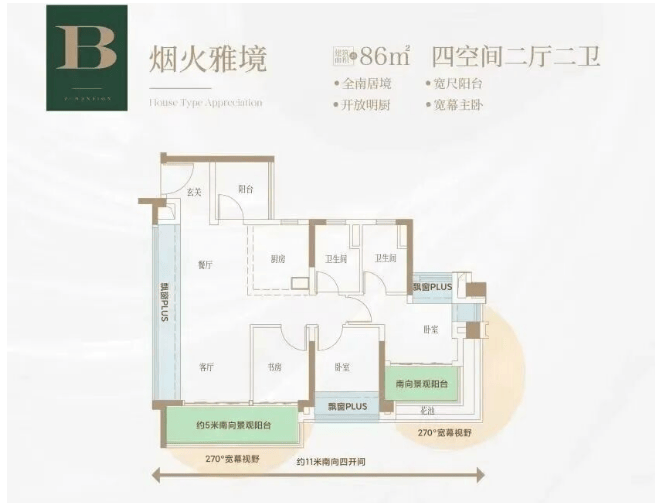 四/五开间朝南设计:主卧套房标配270°环幕飘窗,提升居住舒适度。