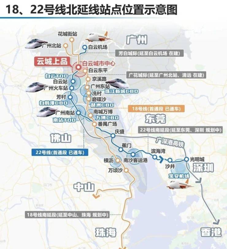云城上品位于白云区嘉禾望岗板块,该区域是广州北部重要交通枢纽和城市发展节点。根据广州十四五规划,白云区将围绕建设国际大都市现代化中心城区的总体目标,打造五大功能片区。其中白云中部区域将重点推进白云城市中心建设,通过轨道交通站点周边TOD综合开发,形成商务服务、行政公共服务以及文化休闲等多功能城市核心。云城上品正位于规划中的白云城市中心站上盖位置。交通方面,项目拥有明显优势。白云城市中心站规划为地铁18号线与22号线交汇站点,两条线路均为广州高速地铁线路,设计最高运行时速可达160公里。通过18号线可以快速连接广州东站、珠江新城、琶洲以及南沙等核心区域,实现城市商务区之间的高效通勤。通过22号线则可以连接广州南站以及白云机场等重要交通枢纽,形成覆盖海陆空交通网络的快速通道。从项目出发,未来三站即可到达广州东站,四站即可抵达珠江新城商务区。项目还规划专属归家通道,业主可以通过社区电梯直接进入地铁站,实现无缝换乘的出行体验。除了轨道交通外,项目周边道路网络也较为完善,通过城市快速路可快速连接天河、海珠等广州核心城区,进一步提升日常通勤效率。