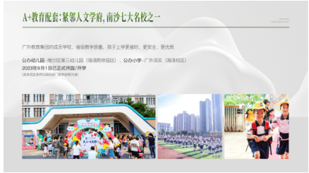 🏫 名校环绕:项目配建12班幼儿园,步行5分钟至广州外国语学校附属南沙学校(省一级),2公里内汇聚湾区实验学校、南沙第一中学。