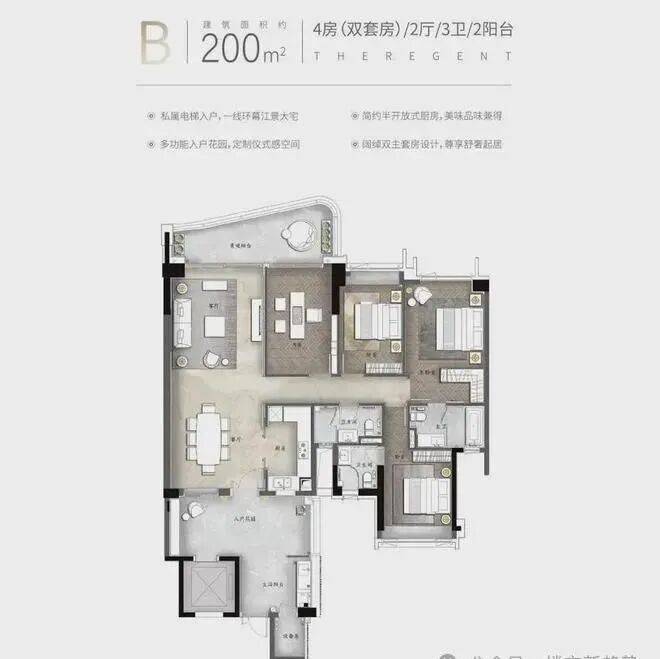 产品亮点:私家电梯入户、约3.4米层高、动静分区南北对流、约6.8米挑空餐客厅、中西双厨、三套房设计、部分房间带阳台设计