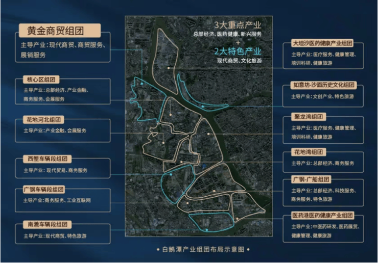 核心商圈:白鹅潭核心商圈规划建设多个高端商业综合体、星级酒店、总部写字楼,涵盖奢侈品零售、高端餐饮、商务会所、休闲娱乐等业态,对标珠江新城花城广场,打造西翼顶级商业地标;