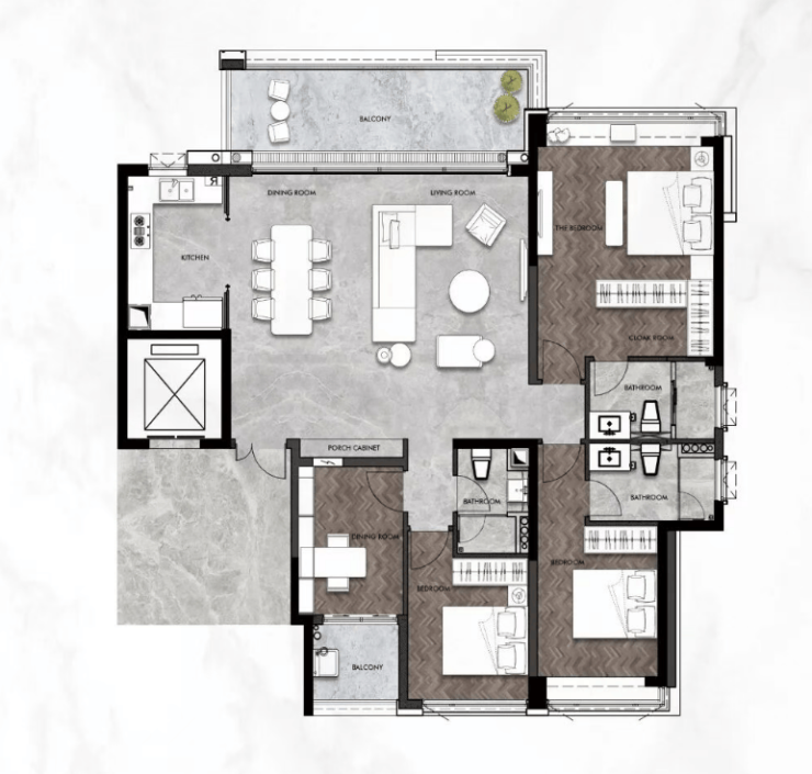 235㎡五房两厅三卫:顶奢终极改善户型,超大尺度空间,五房设计满足多代同堂或家庭社交需求,双套间主卧、超大观景阳台、独立家政间,细节考究,空间无浪费,是高净值人群终极置业的优选。