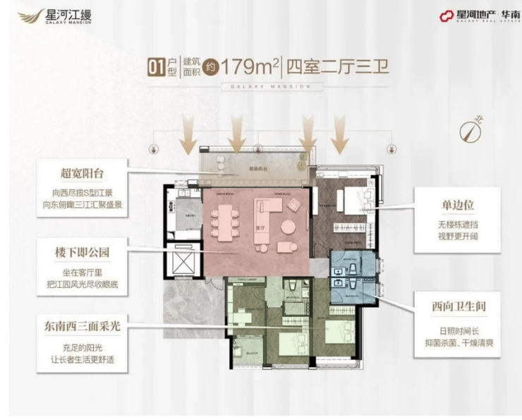 179㎡四房两厅三卫:经典改善户型,南北通透、全明格局,南向超大观景阳台,直面江景,主卧套房设计,配备独立衣帽间、卫浴,空间奢阔,满足三代同堂或二孩家庭居住需求;